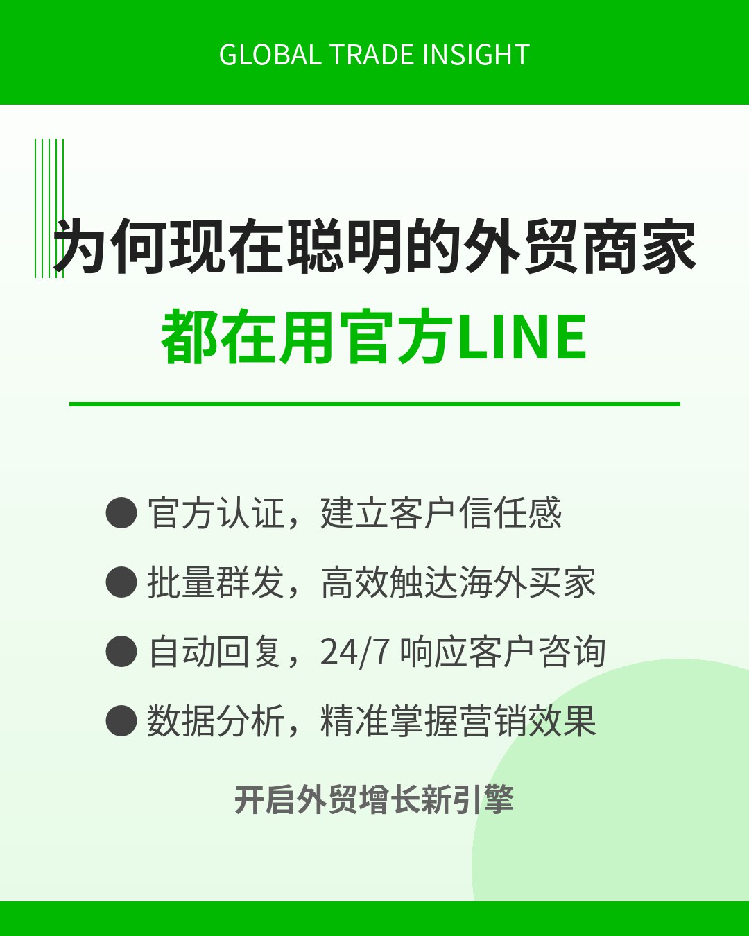 对于主攻这些市场的B2B/B2C外贸企业来说,客户在哪里,商家就应该在哪里。LINE比邮件更即时,比电话更礼貌,是建立信任和促成交易的完美桥梁。