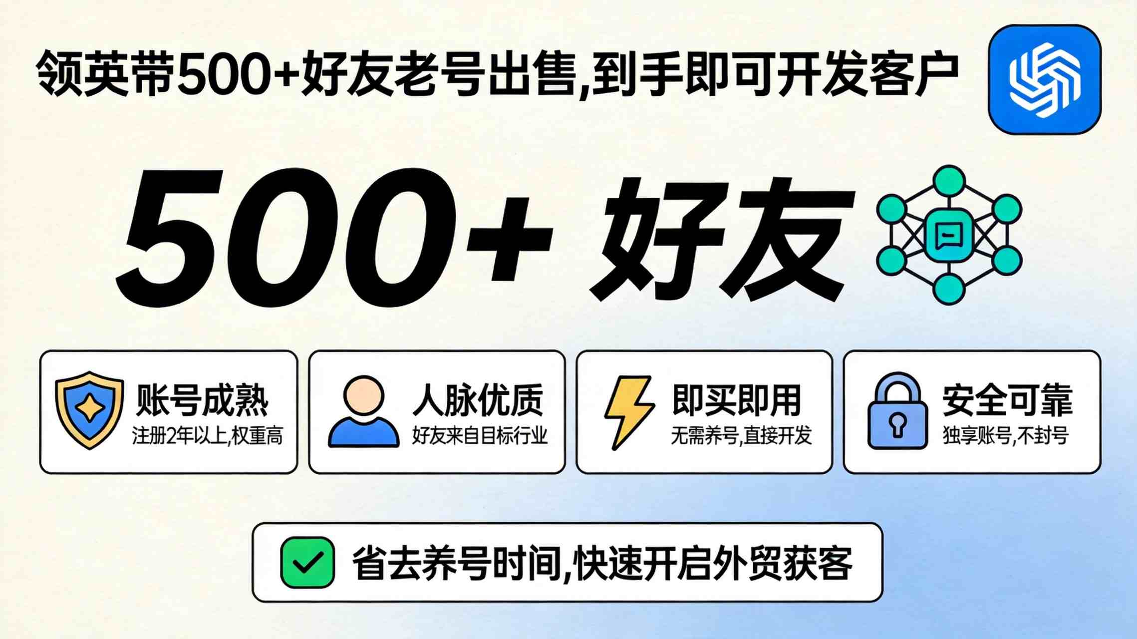 选号时重点看好友质量(真人、活跃、行业相关),到手后按过渡节奏操作,10天进入工作状态。对于需要快速产出的外贸团队和营销人员来说,带好友的号是投入产出比最高的选择。