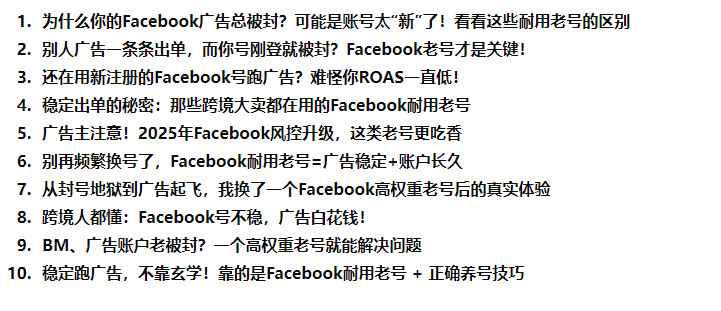 而那些能长期稳定跑广告的卖家,往往使用的是Facebook耐用老号——这些老号注册时间长、登录记录真实、互动历史丰富,系统更信任。
